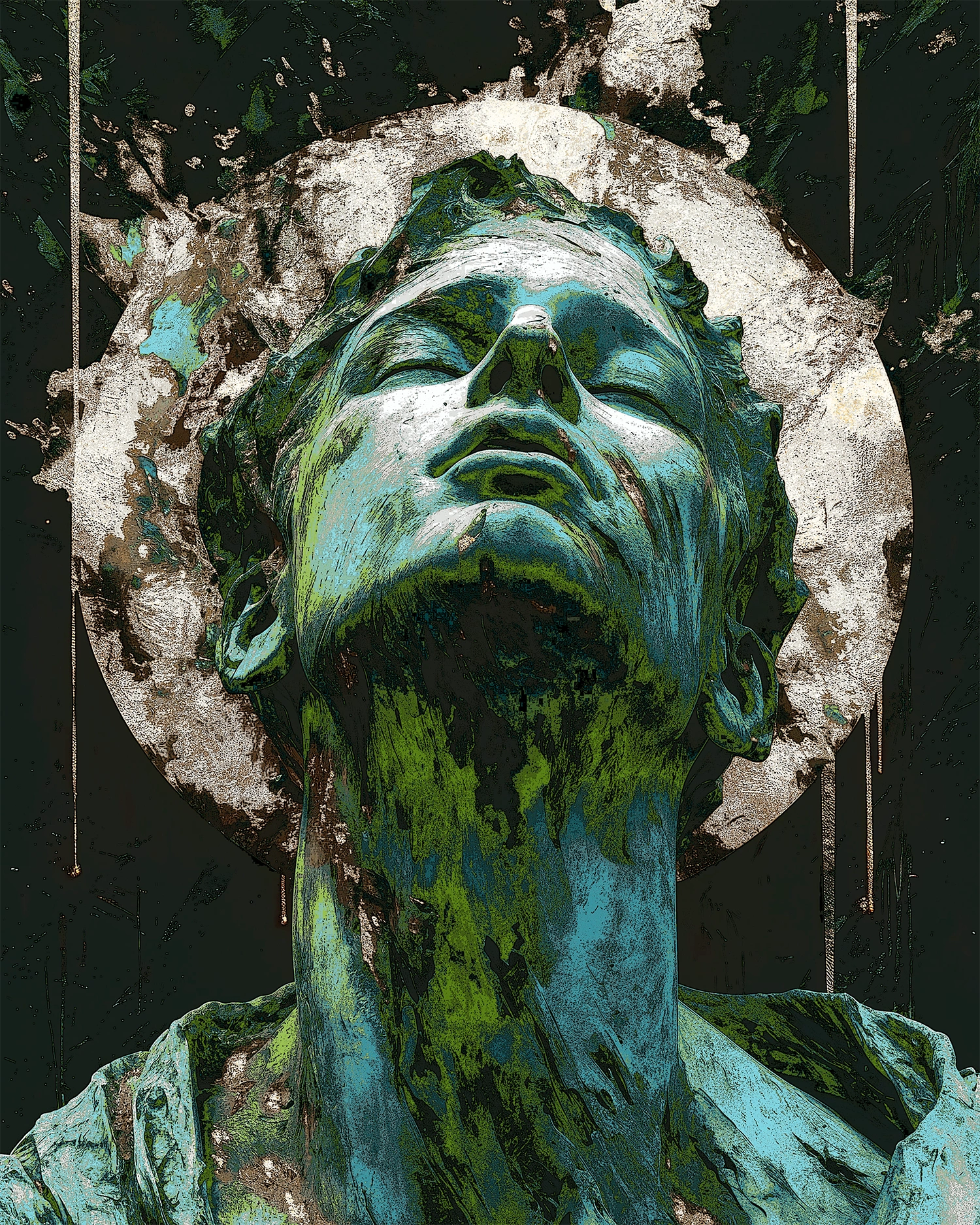 This piece reimagines a classical bust as a living relic, suggesting centuries of exposure to time, elements, and memory. It hints at resilience forged through erosion rather than perfection. The subject is rising from ruin to claim a new kind of divinity rooted in endurance, vulnerability, and transformation.